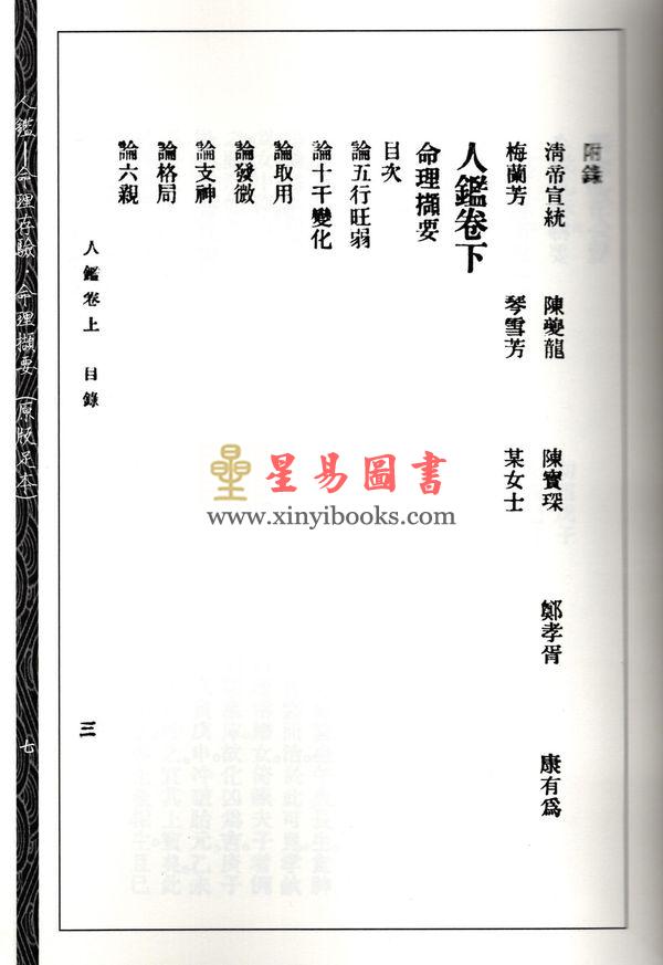 《民國名人命譜》原名《人鑑》,作者(觀瀑主人)本名 林庚白,是民初著名的詩人,著有《子樓隨筆》 《麗白樓詩》(與林北麗合著)等書。林庚白精通命理, 二十八歲撰此書。書裡收集有孫中山、袁世凱、黎元洪、曹 錕等數任總統:段祺瑞、馮國璋、徐樹錚、汪兆銘(精衛) 等幾位總理:吳佩孚、馮玉祥、張作霖、陳炯明等大軍閥; 黃興仲凱、許崇智等革命元勳:康有為;梁啟超、章炳麟 (太炎)、胡適等多位大學者之八字,共計一百一十八名, 於民國十三年(一九二四)印行初版。